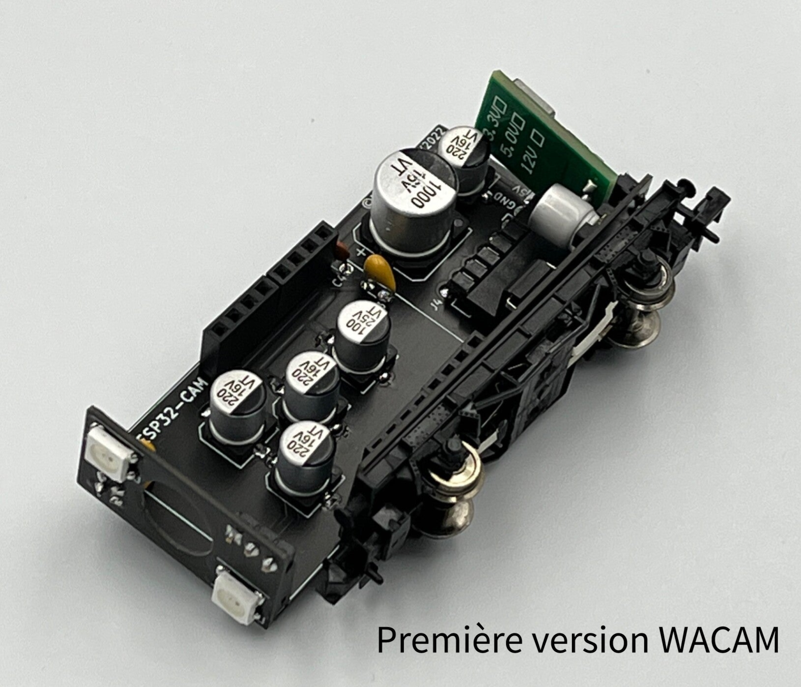 Le wagon caméra échelle N (WACAM-N) est bâti sur un châssis de wagon tombereau et positionné en tête de convoi afin d’offrir la vision du conducteur du train. Les images captées sont accessibles via un serveur de streaming embarqué dans un microcontrôleur ESP32-CAM. La connexion à ce serveur s’effectue en temps réel par le réseau WIFI.